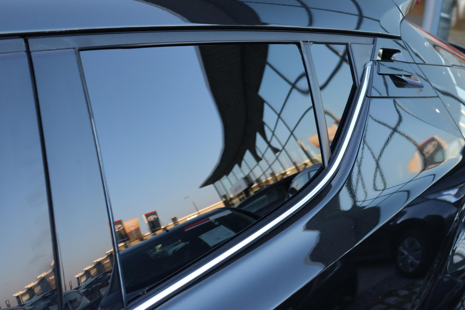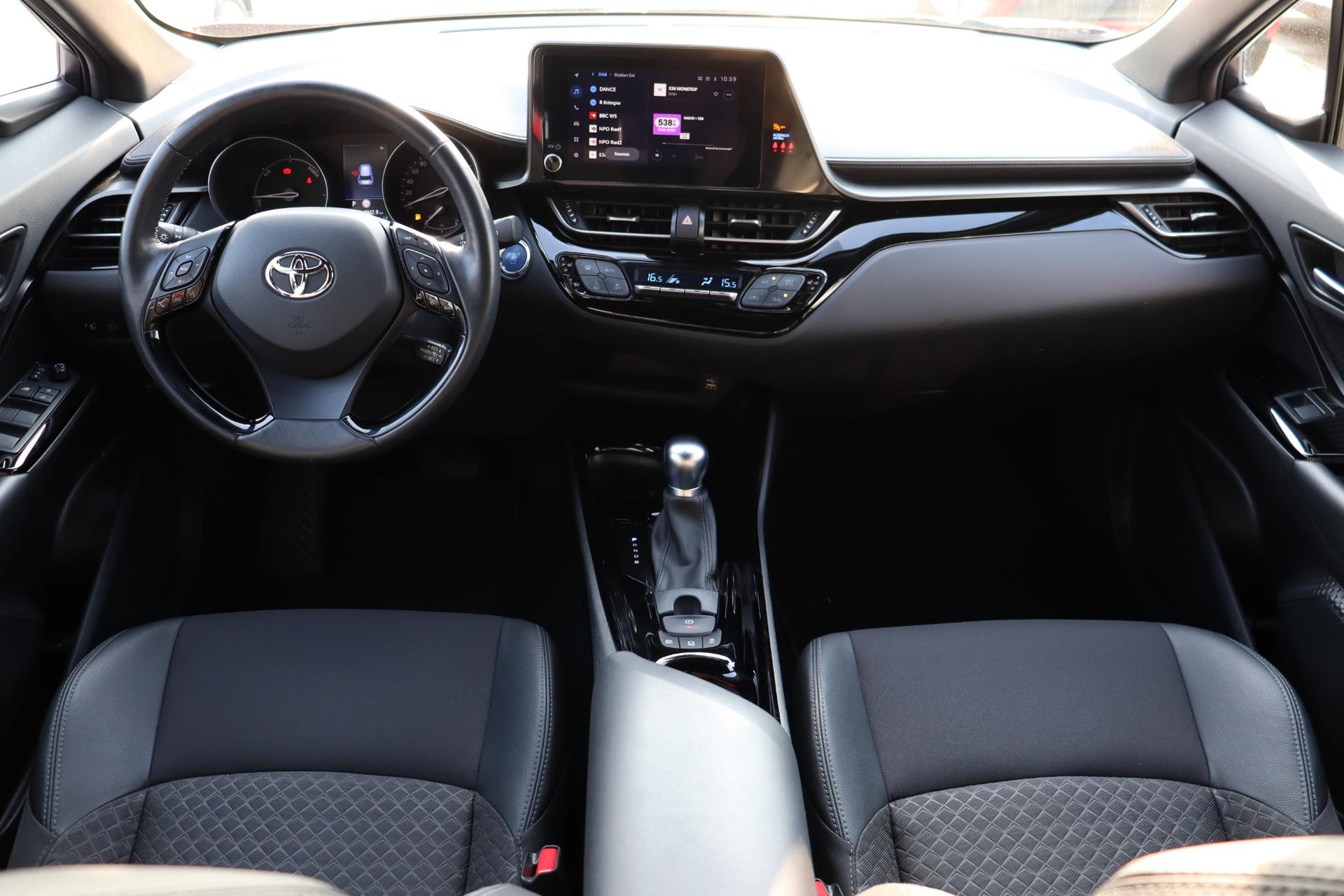Jonge CHR 1.8 Hybrid Style Limited  in de kleur Night sky black metallic. Deze Coupe High Rider is voorzien van Stoelverwarming, navigatie systeem,  Blind spot monitor, parkeersensoren voor en achter, Adaptive cruise control, deels lederen bekleding, Apple carplay, Android auto en meer!